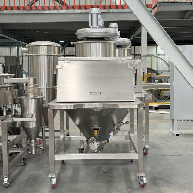 1. When materials are being fed in, the equipment uses an internal negative pressure device to create a local negative pressure environment, firmly controlling the dust generated during the feeding process within the sealed feeding bin, preventing it from escaping outward;